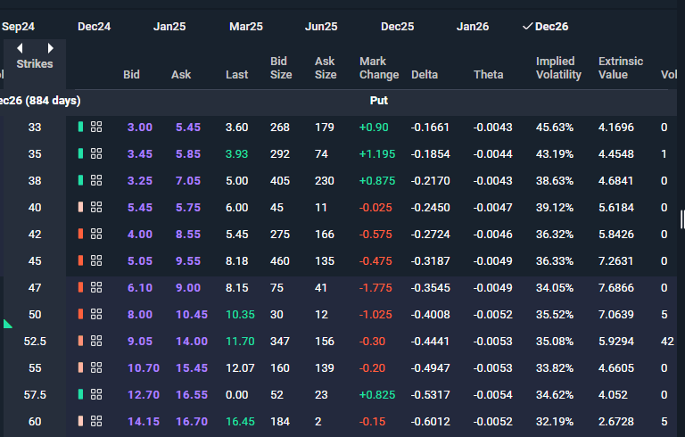 Looking at the $47 put, we can see that it’s trading with a bid of $6.10 and an ask of $9.00. That represents a little over 25% of the strike value, so your maximum potential loss would be about 25% if you purchased the put. That’s not bad for 884 days of protection.