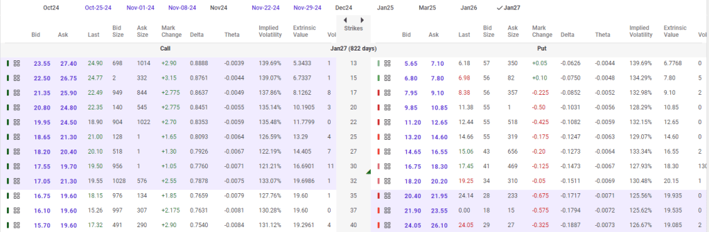 To pay for the puts, it’s profitable in the short term to sell options against it. I recommend going long 30-strike puts expiring in January 2026 or 2027, and then selling sub-10 puts against it 3 weeks out or more.