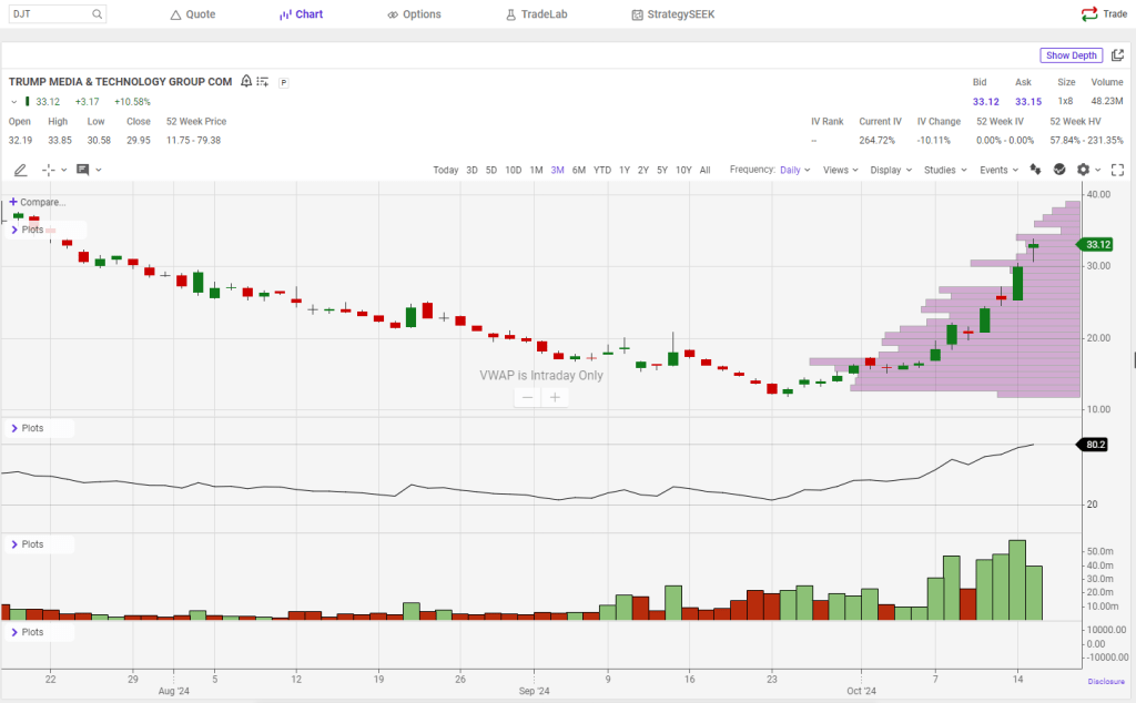 I understand the optics of discussing anything political just weeks before an election can be toxic. Donald Trump’s influence on his stock, DJT, makes it a compelling trade in either direction. If you’re bullish on Republicans, you’re likely bullish on DJT. If you’re bearish on Republicans, you’re likely bearish on DJT. That’s about as far as I’ll go into the background here; the goal is to focus on money, not politics.