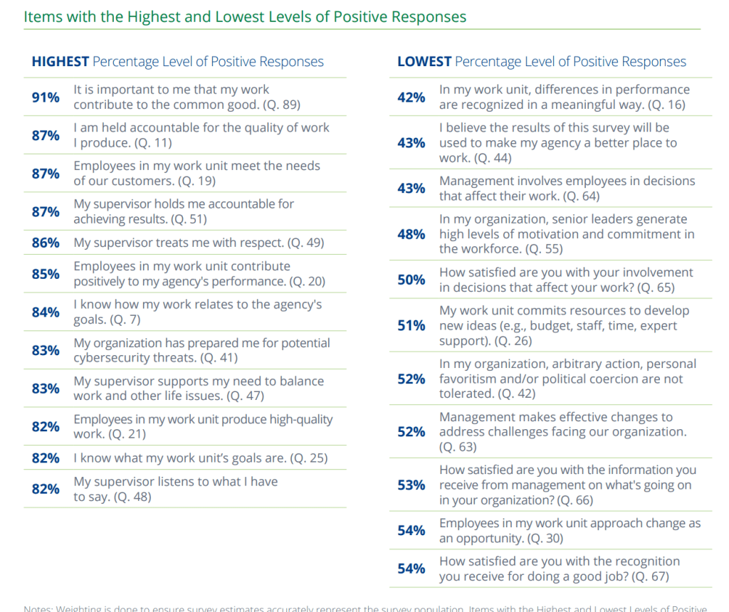 So how do we measure the effectiveness of government employees if we can’t rely on profits and losses? We can use a few other metrics, including internal and external perception. When I say internal perception, I mean an internal review of the value employees add through their work. Would it surprise you to hear that 91% of government workers believe their jobs add value? I’m trying to find the article that compared the views of federal employees to those in the private sector, but the conclusion was that federal employees were more likely to believe their jobs had worth than their private-sector counterparts.